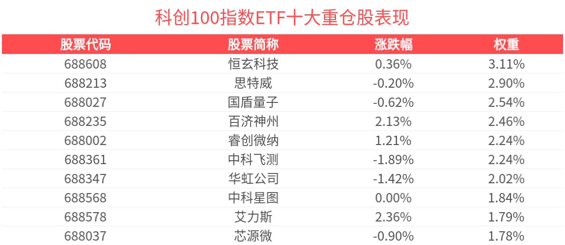 According to the data, as of February 28, 2025, the top ten weighted stocks of the SSE Science and Technology Innovation Board 100 Index (000698) are Smartway (688213), BeiGene (688235), Hengxuan Technology (688608), Ruichuang Micro-Nano (688002), Zhongke Feitest (688361), Yuntian Lifei (688343), Allist (688578), Guodun Quantum (688027), Huahong Company (688347), Green harmonic (688017), the top ten weighted stocks accounted for 24.45% of the total.