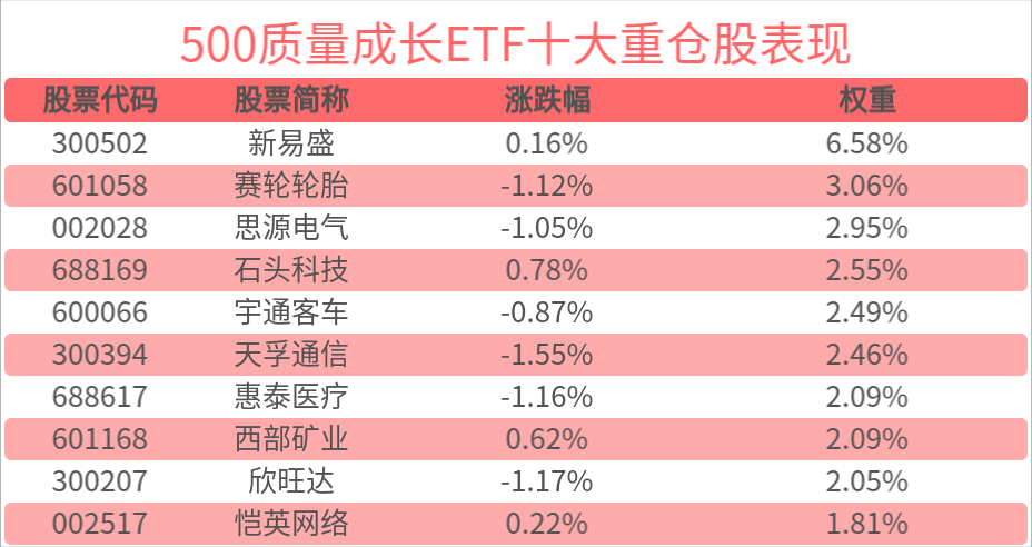 According to the data, as of December 31, 2024, the top ten weighted stocks in the CSI 500 Quality Growth Index (930939) are Crystal Optoelectronics (002273), Dong'e Ejiao (000423), Western Mining (601168), Chifeng Gold (600988), Nine Company (689009), Shenzhou Taiyue (300002), Kaiying Network (002517), Jingchen (688099), and Power Investment Energy (002128) , Anker Innovations (300866), the top ten weighted stocks accounted for 21.61% of the total.